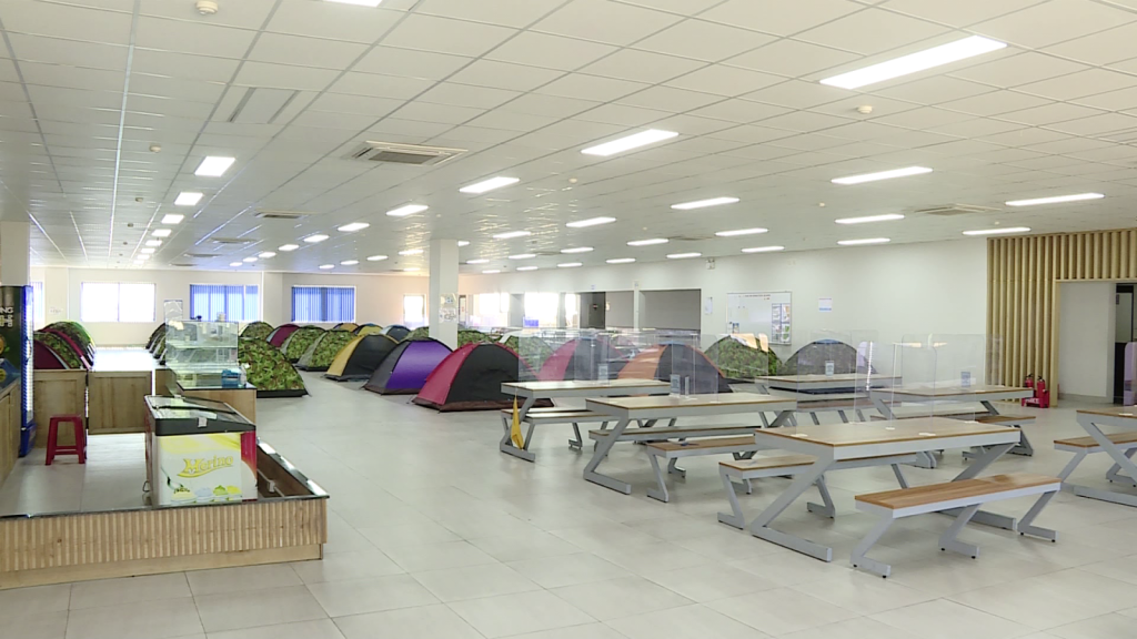 Đây là khu xưởng được công ty sản xuất linh kiện máy bay UAC bố trí riêng cho nhóm công nhân liên quan đến ca bệnh COVID-19 được phát hiện tại công ty trước đây. Thay vì phải cách ly tại nhà, công ty mất nhân lực sản xuất, công nhân mất thu nhập, phương án 3 tại chỗ đã được thực hiện, nhóm công nhân được bố trí ăn tại chỗ, ngủ tại chỗ và sản xuất tại chỗ.