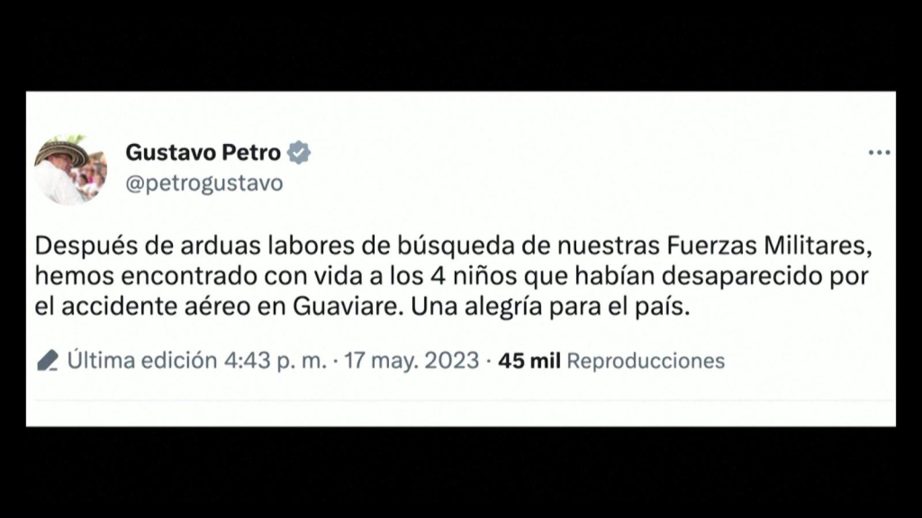 Trong thông điệp đăng trên Twitter, Tổng thống Petro vui mừng thông báo đã tìm thấy 4 trẻ em được cho là mất tích sau những nỗ lực tìm kiếm không ngừng của quân đội.