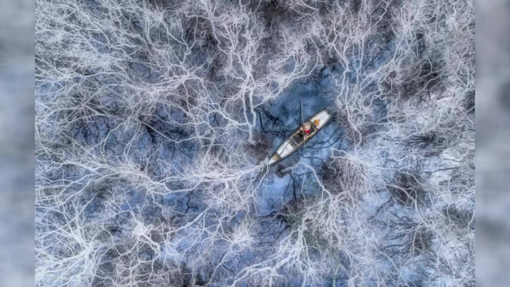 Tác phẩm được nhiếp ảnh gia Phạm Huy Trung thực hiện ở phá Tam Giang, tỉnh Thừa Thiên Huế vào mùa đông, khi rừng chà rụng lá và chuyển màu trắng. nhìn kỹ, bức ảnh cho thấy một ngư dân đang bắt đầu ngày đánh cá của mình trong rừng ngập mặn.
