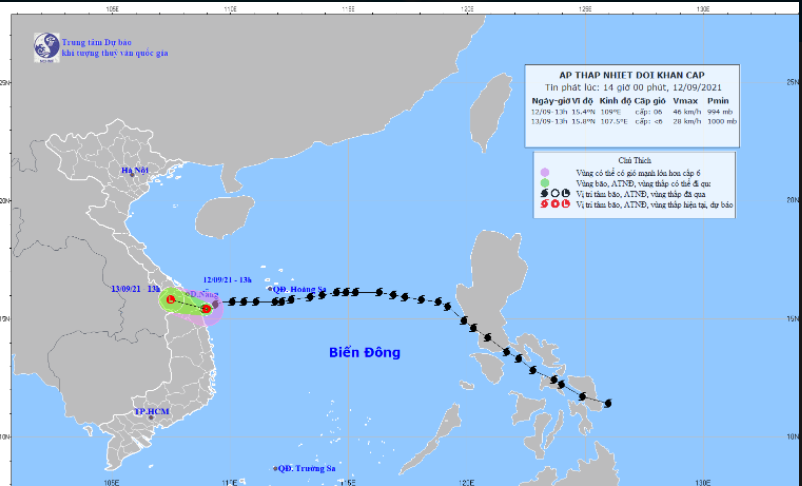Hồi 13 giờ ngày 12/9, vị trí tâm áp thấp nhiệt đới ở khoảng 15,4 độ Vĩ Bắc; 109,0 độ Kinh Đông, ngay trên vùng biển từ Đà Nẵng đến Quảng Ngãi. Sức gió mạnh nhất vùng gần tâm áp thấp nhiệt đới mạnh cấp 6 (40-50km/giờ), giật cấp 8. Bán kính gió mạnh cấp 6, giật cấp 8 khoảng 50km tính từ tâm áp thấp nhiệt đới.