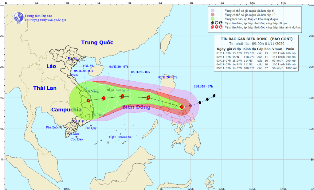 Hồi 07 giờ ngày 01/11, vị trí tâm bão ở khoảng 13,5 độ Vĩ Bắc; 123,6 độ Kinh Đông, trên khu vực miền Trung Phi-líp-pin. Sức gió mạnh nhất vùng gần tâm bão mạnh cấp 15 (165-185km/giờ), giật cấp 17.