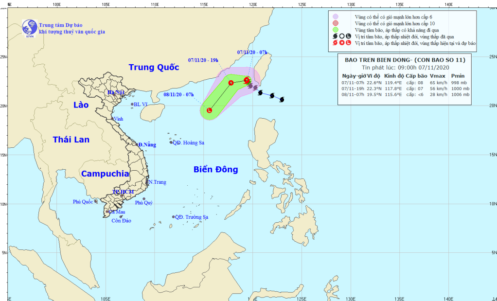 Hồi 07 giờ ngày 07/11, vị trí tâm bão ở khoảng 22,6 độ Vĩ Bắc; 119,4 độ Kinh Đông, ngay trên vùng biển phía Tây Nam đảo Đài Loan. Sức gió mạnh nhất vùng gần tâm bão mạnh cấp 8 (60-75km/giờ), giật cấp 10. Bán kính gió mạnh từ cấp 6, giật từ cấp 8 trở lên khoảng 100km tính từ tâm bão.