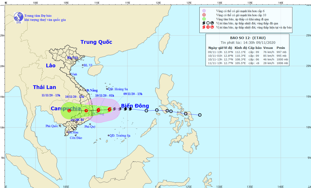 Dự báo trong 12 giờ tới, bão di chuyển theo hướng Tây, mỗi giờ đi được 15-20km và có khả năng mạnh thêm. Đến 01 giờ ngày 10/11, vị trí tâm bão ở khoảng 12,8 độ Vĩ Bắc; 110,3 độ Kinh Đông, cách bờ biển các tỉnh từ Bình Định đến Ninh Thuận khoảng 120km về phía Đông. Sức gió mạnh nhất vùng gần tâm bão mạnh cấp 9 (75-90km/giờ), giật cấp 12 .