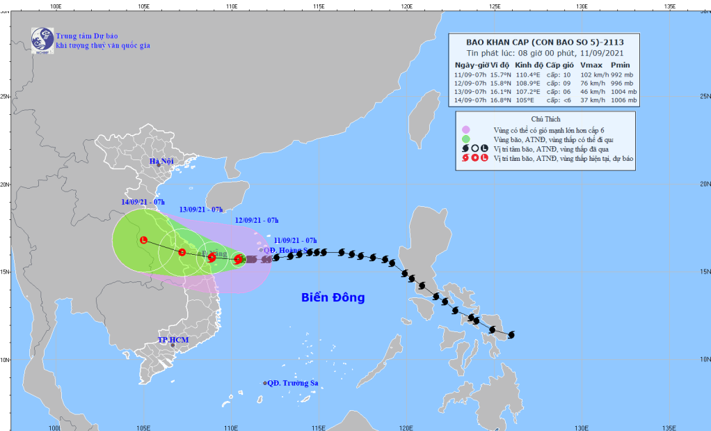 Dự báo trong 24 giờ tới, bão di chuyển chậm theo hướng Tây, mỗi giờ đi được khoảng 5km. Đến 07 giờ ngày 12/9, vị trí tâm bão ở khoảng 15,8 độ Vĩ Bắc; 108,9 độ Kinh Đông, trên vùng biển khu vực từ Quảng Trị-Quảng Nam. Sức gió mạnh nhất vùng gần tâm bão mạnh cấp 8-9 (60-90km/giờ), giật cấp 11.