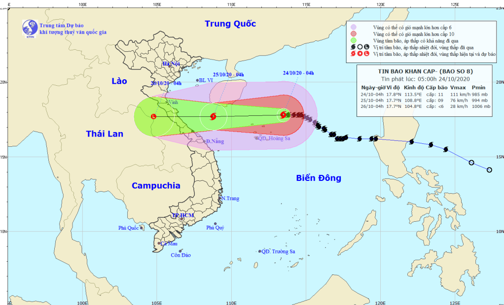 Trung tâm Dự báo khí tượng thủy văn quốc gia cho biết, hồi 04 giờ ngày (24/10), vị trí tâm bão ở khoảng 17,8 độ Vĩ Bắc; 113,5 độ Kinh Đông, cách quần đảo Hoàng Sa khoảng 160km về phía Đông Đông Bắc. Sức gió mạnh nhất vùng gần tâm bão mạnh cấp 11 (100-115km/giờ), giật cấp 13. Bán kính gió mạnh từ cấp 6, giật từ cấp 8 trở lên khoảng 200km tính từ tâm bão; bán kính gió mạnh từ cấp 10, giật từ cấp 12 trở lên khoảng 100km tính từ tâm bão.