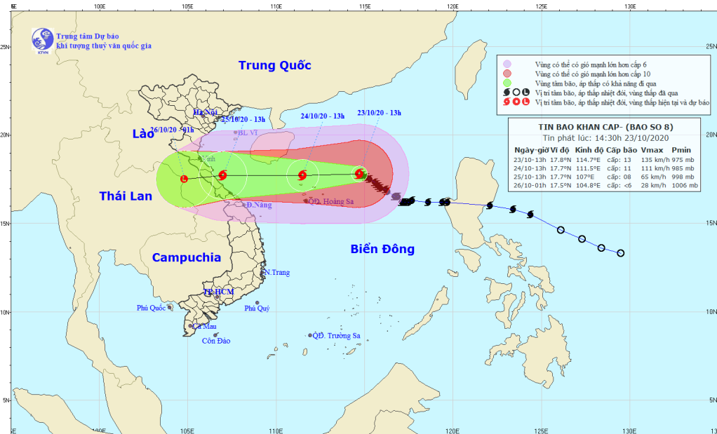 Theo thông tin từ Khí tượng thủy văn Quốc gia, hồi 13 giờ ngày (23/10), vị trí tâm bão ở khoảng 17,8 độ Vĩ Bắc; 114,7 độ Kinh Đông, cách quần đảo Hoàng Sa khoảng 280km về phía Đông Đông Bắc. Sức gió mạnh nhất vùng gần tâm bão mạnh cấp 12-13 (115-150km/giờ), giật cấp 15. Bán kính gió mạnh từ cấp 6, giật từ cấp 8 trở lên khoảng 260km tính từ tâm bão; bán kính gió mạnh từ cấp 10, giật từ cấp 12 trở lên khoảng 160km tính từ tâm bão.