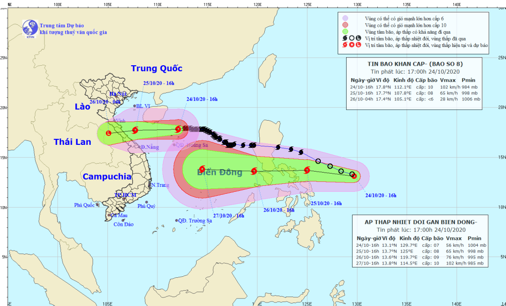 Dự báo trong 24 giờ tới, bão di chuyển theo hướng tây, mỗi giờ đi được 15-20km. Đến 16 giờ ngày 25-10, vị trí tâm bão ở khoảng 17,7 độ Vĩ Bắc; 107,8 độ Kinh Đông, cách đất liền các tỉnh Hà Tĩnh đến Quảng Trị khoảng 140km về phía đông. Sức gió mạnh nhất vùng gần tâm bão mạnh cấp 8 (60-75km/giờ), giật cấp 10.