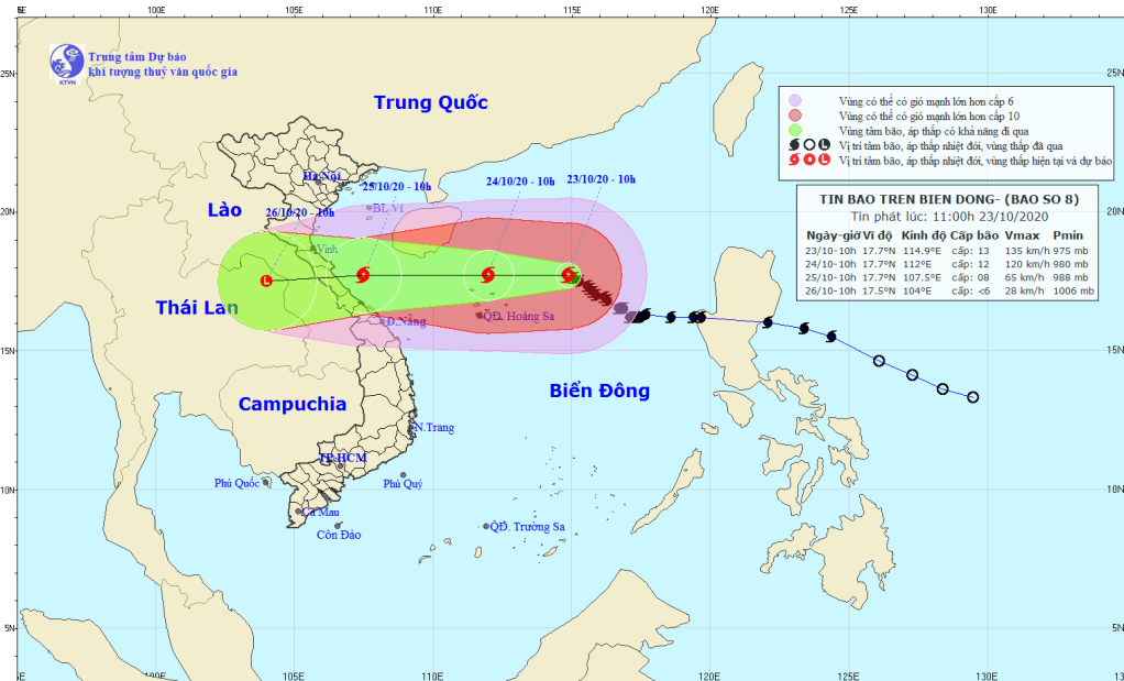 Hồi 11 giờ ngày (23/10), vị trí tâm bão ở khoảng 17,7 độ Vĩ Bắc; 114,9 độ Kinh Đông, cách quần đảo Hoàng Sa khoảng 300km về phía Đông Đông Bắc. Sức gió mạnh nhất vùng gần tâm bão mạnh cấp 12-13 (115-150km/giờ), giật cấp 15. Bán kính gió mạnh từ cấp 6, giật từ cấp 8 trở lên khoảng 260km tính từ tâm bão; bán kính gió mạnh từ cấp 10, giật từ cấp 12 trở lên khoảng 160km tính từ tâm bão.