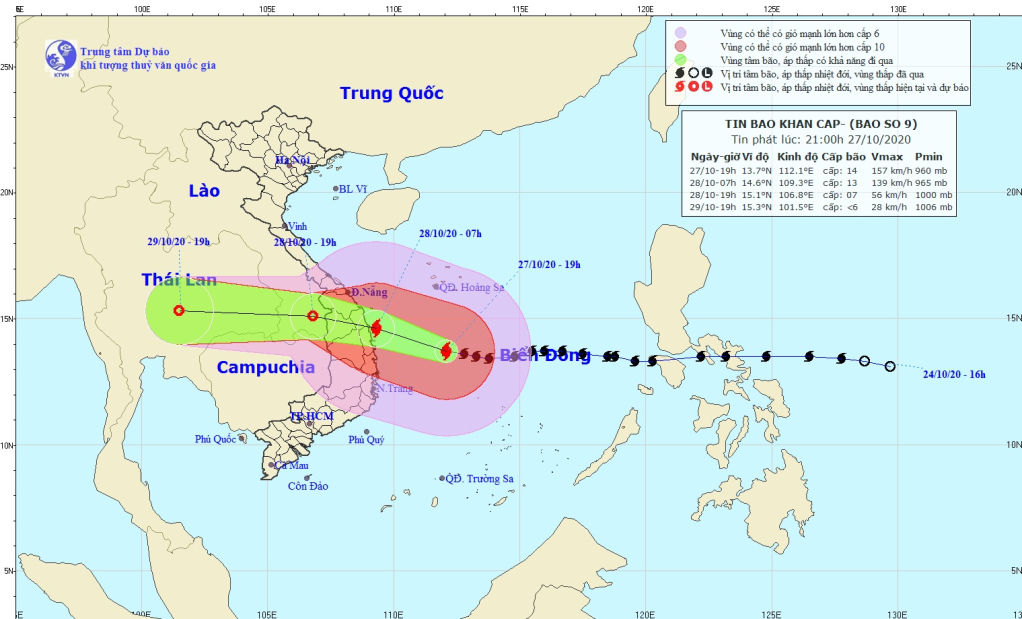 Do ảnh hưởng của bão số 9 ở đảo Lý Sơn (Quảng Ngãi) đã có gió mạnh cấp 8, giật cấp 10. Hồi 19 giờ ngày 27/10, vị trí tâm bão ở khoảng 13,7 độ Vĩ Bắc; 112,1 độ Kinh Đông, cách Đà Nẵng khoảng 480km, cách Quảng Nam 430km, cách Quảng Ngãi 380km, cách Phú Yên 320km. Sức gió mạnh nhất vùng gần tâm bão mạnh cấp 14 (150-165km/giờ), giật cấp 17. Bán kính gió mạnh từ cấp 6, giật từ cấp 8 trở lên khoảng 320km tính từ tâm bão; bán kính gió mạnh từ cấp 10, giật từ cấp 12 trở lên khoảng 160km tính từ tâm bão.