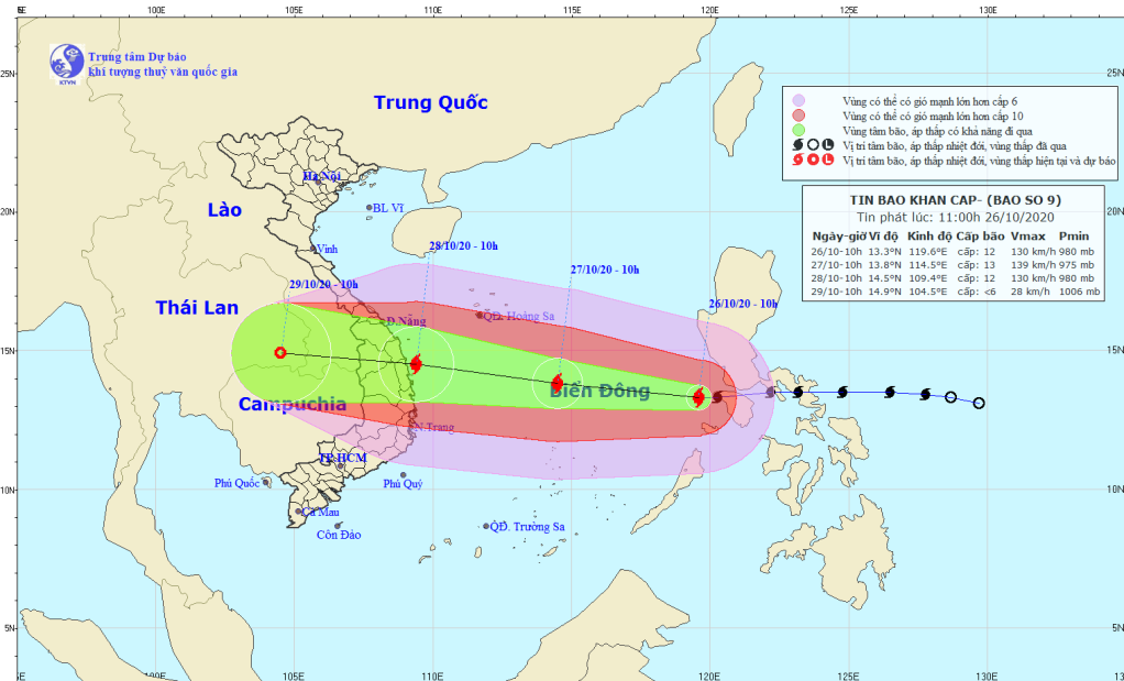 Dự báo trong 24 giờ tới, bão di chuyển theo hướng Tây, mỗi giờ đi được 20-25km và tiếp tục mạnh thêm. Đến 10 giờ ngày 27/10, vị trí tâm bão ở khoảng 13,8 độ Vĩ Bắc; 114,5 độ Kinh Đông, cách đảo Song Tử Tây khoảng 280km về phía Bắc. Sức gió mạnh nhất vùng gần tâm bão mạnh cấp 12-13 (115-150km/giờ), giật cấp 15.