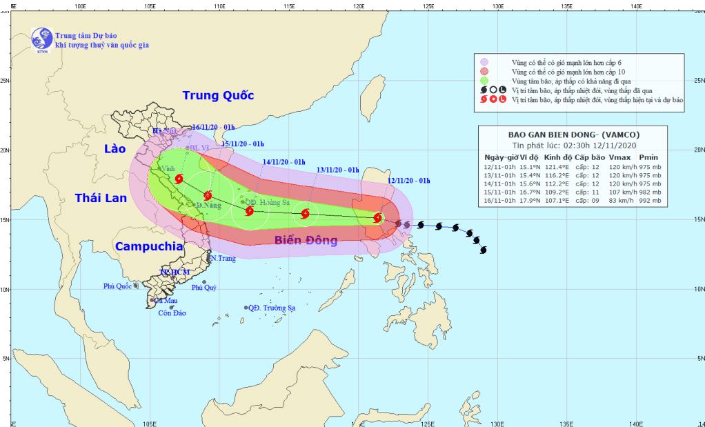 Hồi 01 giờ sáng nay (12/11), vị trí tâm bão ở khoảng 15,1 độ Vĩ Bắc; 121,4 độ Kinh Đông, trên khu vực phía Đông Nam đảo Lu-dông (Phi-líp-pin). Sức gió mạnh nhất vùng gần tâm bão mạnh cấp 12 (115-135km/giờ), giật cấp 15.