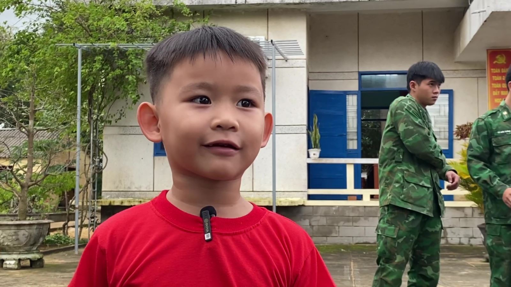 Cháu Lê Đức Phước, Trường mầm non phường Phổ Vinh, thị xã Đức Phổ, Quảng Ngãi nói: Hôm nay đi chuyến tham quan này con rất là vui và thêm yêu chú bộ đội nhiều.