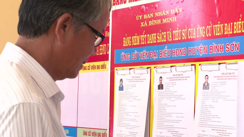 6 khu vực bỏ phiếu trên địa bàn xã Bình Minh, huyện Bình Sơn đã niêm yết danh sách ứng cử viên đại biểu Quốc hội và đại biểu HĐND các cấp, nhiệm kì 2021-2026. Cử tri đã nghiên cứu kĩ tiểu sử từng ứng cử viên để lựa chọn người xứng đáng nhất.