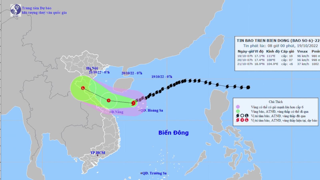 Theo Trung tâm Dự báo Khí tượng Thủy văn Quốc gia, hiện bão số 6 đang trên vùng biển phía Tây Bắc quần đảo Hoàng Sa. Sức gió mạnh nhất vùng gần tâm bão mạnh cấp 9-10, giật cấp 12, di chuyển theo hướng Tây Tây Nam với tốc độ 10-15km/h. Nhiều khả năng bão số 6 sẽ suy yếu rất nhanh trong 24 giờ tới.