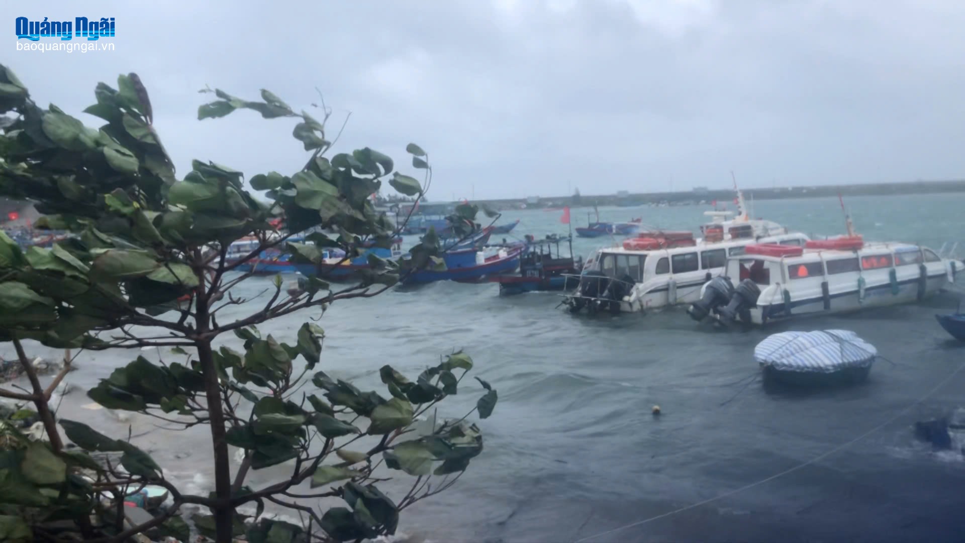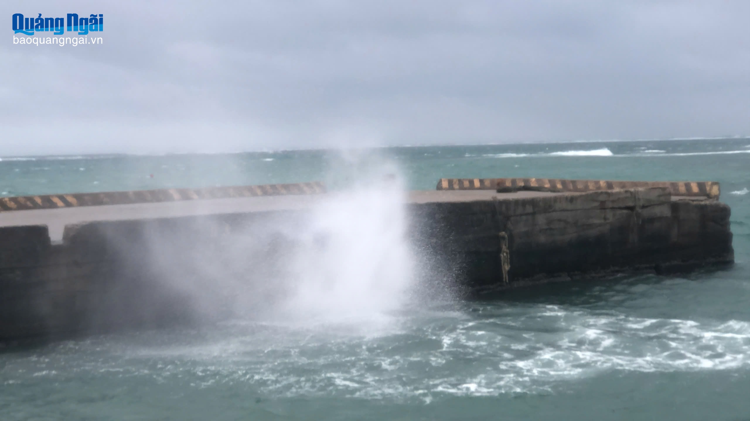 Sáng nay, tại các khu vực ven bờ biển đặc khu Lý Sơn bắt đầu có mưa nặng hạt, gió giật mạnh cấp 6, cấp 7, có lúc đạt cấp 9. Sóng biển liên tục dâng cao, bọt nước đập mạnh, tung trắng xóa vào bờ kè và khu vực cảng.