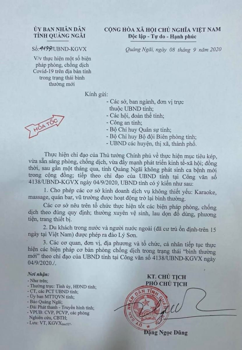 Sau gần một tháng, tỉnh Quảng Ngãi không phát sinh ca bệnh mới trong cộng đồng. Ngày 08/9, UBND tỉnh Quảng Ngãi ban hành công văn số 4199/UBND-KGVX về việc thực hiện một số biện pháp phòng, chống dịch Covid-19 trên địa bàn tỉnh trong trạng thái bình thường mới.