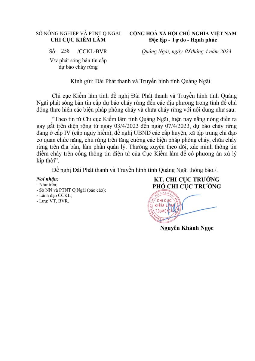 Theo tin từ Chi cục Kiểm lâm tỉnh Quảng Ngãi, hiện nay nắng nóng diễn ra gay gắt trên diện rộng từ ngày 03/4/2023 đến ngày 07/4/2023, dự báo cháy rừng đang ở cấp IV (cấp nguy hiểm). Để chủ động thực hiện các biện pháp phòng cháy và chữa cháy rừng, ngày 03/4/2023 Chi cục Kiểm lâm có Công văn số 258/CCKL-BVR, nội dung Công văn như sau: