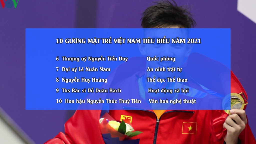 10 gương mặt trẻ Việt Nam tiêu biểu năm 2021 là Nguyễn Lê Thảo Anh, tiến sĩ Nguyễn Trọng Hiếu thuộc lĩnh vực học tập, nghiên cứu. Ở lĩnh vực lao động sản xuất, kinh doanh là Lưu Đức Phong, thạc sỹ Hồ Xuân Vinh và Vũ Gia Luyện. Thượng úy Nguyễn Tiến Duy và đại úy Lê Xuân Nam là 2 gương mặt của lĩnh vực Quốc phòng, an ninh. Thạc sỹ, bác sĩ Đỗ Doãn Bách là gương mặt tiêu ở lĩnh vực hoạt động xã hội. 2 gương mặt tiêu biểu ở lĩnh vực thể thao và văn hóa thuộc về vận động viên bơi lộ Nguyễn Huy Hoàng và hoa hậu Nguyễn Thúc Thùy Tiên.
