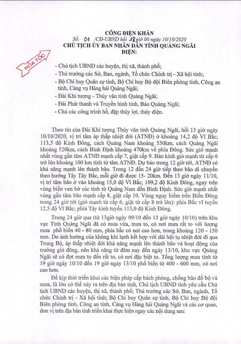 Để kịp thời triển khai các biện pháp cấp bách phòng, chống bão đổ bộ và mưa, lũ lớn có thể xảy ra trên địa bàn tỉnh, Chủ tịch UBND tỉnh yêu cầu Chủ tịch UBND các huyện, thị xã, thành phố; Thủ trưởng các Sở, Ban, ngành, Tổ chức Chính trị - Xã hội tỉnh; Bộ Chỉ huy Quân sự tỉnh, Bộ Chỉ huy Bộ đội Biên phòng tỉnh, Công an tỉnh, Cảng vụ Hàng hải Quảng Ngãi và các cơ quan, đơn vị trên địa bàn tỉnh triển khai thực hiện ngay các nội dung sau: