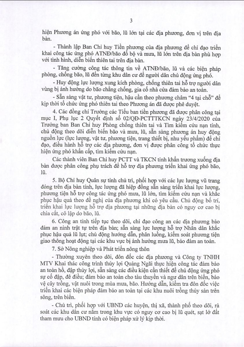 4. Các đồng chí Trưởng các Tiểu ban tiền phương đã được phân công tại mục I, Phụ lục 2 Quyết định số 02/QĐ-PCTTTKCN ngày 23/4/2020 của Trưởng ban Ban Chỉ huy Phòng chống thiên tai và Tìm kiếm cứu nạn tỉnh, chủ động theo dõi diễn biến bão và mưa, lũ, sẵn sàng phương án huy động nguồn lực (lực lượng, vật tư, phương tiện, trang thiết bị, nhu yếu phẩm) để chỉ đạo, điều hành hỗ trợ các địa phương, đơn vị được phân công tổ chức thực hiện ứng phó khẩn cấp, tìm kiếm cứu nạn.