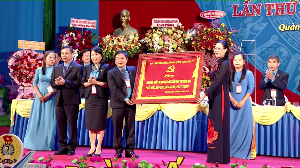 Bí thư Tỉnh ủy tặng Đại hội bức trướng với dòng chữ “Đoàn viên, người lao động và tổ chức công đoàn tỉnh Quảng Ngãi: Đổi mới, dân chủ, đoàn kết, phát triển”.