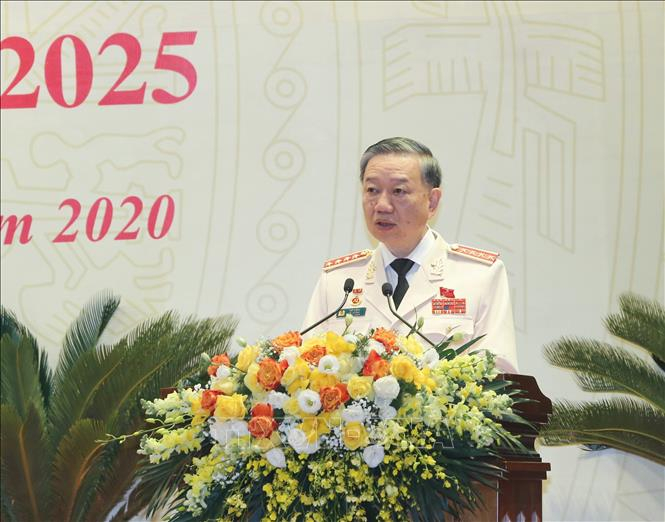 Đại tướng Tô Lâm, Ủy viên Bộ Chính trị, Bí thư Đảng ủy Công an Trung ương, Bộ trưởng Bộ Công an phát biểu khai mạc Đại hội. Ảnh: TTXVN