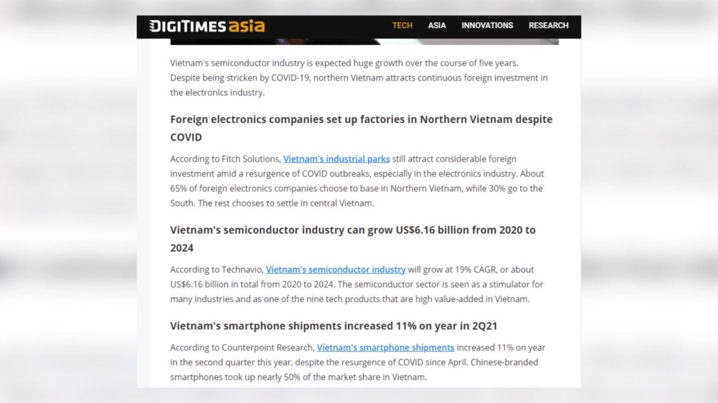 Theo bài viết, Việt Nam vẫn không ngừng thu hút đầu tư nước ngoài vào ngành công nghiệp điện tử bất chấp tác động của đại dịch COVID-19. Bài viết dẫn dự báo của công ty khảo sát và tư vấn về công nghệ Technavio nhận định ngành công nghiệp bán dẫn Việt Nam sẽ tăng trưởng với tốc độ tăng trưởng kép hàng năm là 19%, tương đương khoảng 6,16 tỷ USD trong thời gian từ năm 2020 đến 2024. Cũng theo hãng nghiên cứu thị trường Fitch Solutions, các khu công nghiệp của Việt Nam vẫn thu hút đáng kể vốn đầu tư nước ngoài, đặc biệt trong ngành điện tử.