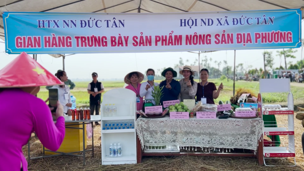 Chị Cao Thị Kim Dung, Bí thư Đoàn xã Đức Tân, Mộ Đức chia sẻ: Địa phương mang đến ngày mùa hôm nay những sẩn phẩm sạch của địa phương như bí đao, bí đỏ, nước dừa, bánh tráng, mạch nha, kẹo gương, nhằm quảng bá sản phẩm của địa phương chúng em. Với Lễ hội ngày mùa hôm nay cũng mong muốn người dân và trẻ em về trải nghiệm những ngày mùa truyền thống của ông bà ta ngày xưa.