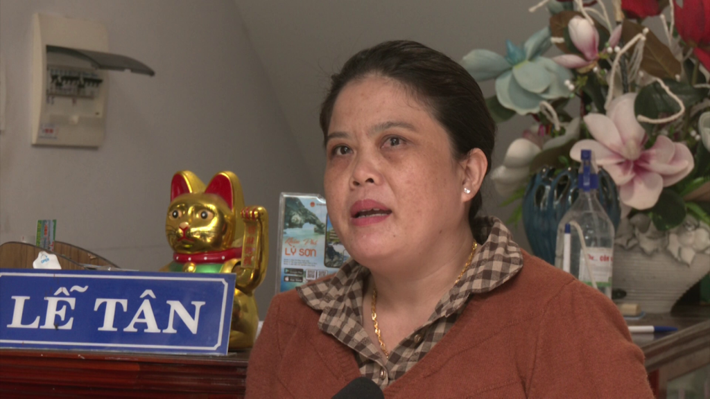 Chị Nguyễn Thị Cẩm Thạch, Nhà nghỉ Thủy Thạch Lý Sơn, Quảng Ngãi nói: Biển động làm thất thu mười mấy triệu gần hai chục triệu đồng tiền chứ không ít đâu.