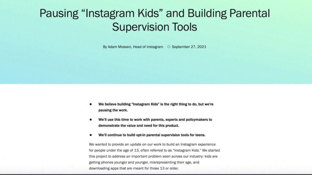 Việc phát triển ứng dụng Instagram Kids cho trẻ dưới 13 tuổi được Facebook công bố từ hồi tháng 3, nhưng gần đây, truyền thông Mỹ đã đăng loạt bài điều tra cho thấy việc các bé gái sử dụng Instagram đã dẫn đến các vấn đề về sức khỏe tâm thần và Facebook có nhận thức được về điều này. Những thông tin trên đã khiến dư luận lo lắng và phản đối, buộc Facebook phải đưa ra quyết định tạm ngừng dự án nói trên. Tuy nhiên, mạng xã hội khổng lồ vẫn bảo lưu quan điểm cho rằng dù có hay không có Instagram Kids, trẻ em cũng vẫn có rất nhiều hoạt động trên không gian mạng nên cần phát triển công cụ bảo vệ nhóm đối tượng này tốt hơn.