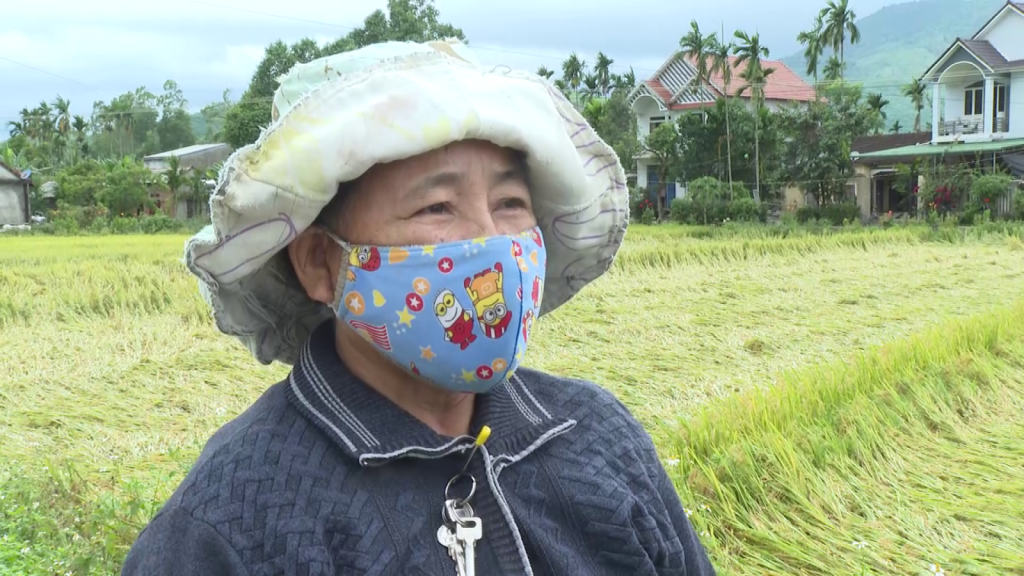 Bà Mai Thị Xuân Thu, Xã Hành Thiện, Nghĩa Hành, Quảng Ngãi nói: Hơn 1 sào lúa của tui bị ngã đổ. Mình lo tát nước ra ngoài mương để hạn chế lúa ngã bị nảy mầm.