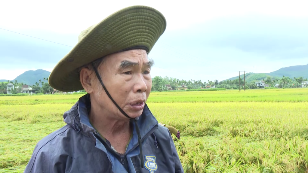 Ông Lưu Minh Luân, Xã Hành Thiện, Nghĩa Hành, Quảng Ngãi nói: Tui có 3,5 sào lúa bị ngã đổ nên vợ chồng giờ lo dựng lúa lên để lúa bớt nảy mầm, chứ lúa thì còn chừng 10 ngày nữa mới gặt.