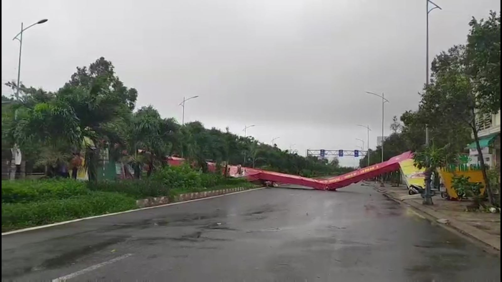 Ghi nhận tại hiện trường, do gió giật mạnh, cổng chào trên đường Hoàng Sa, thuộc xóm Khe Ba, thôn Mỹ Lại, thành phố Quảng Ngãi đã bị sập đỗ hoàn toàn. May mắn không có thương tích về người, tuy nhiên giao thông trên tuyến bị ách tắt.