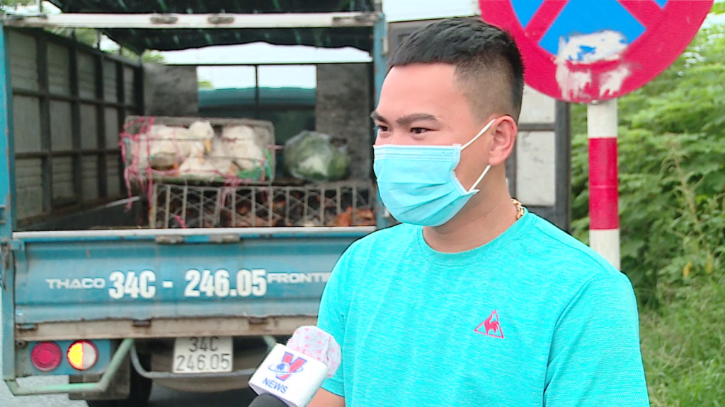 Anh Nguyễn Văn Linh, xã Tuấn Hiệp, huyện Kim Thành, tỉnh Hải Dương nói: Em chở gà từ Kim Thành, Hải Dương lên đây, đến chợ Long Biên, giấy phép luồng xanh của em ở dưới Hải Dương đang quá tải lên chưa xin được.