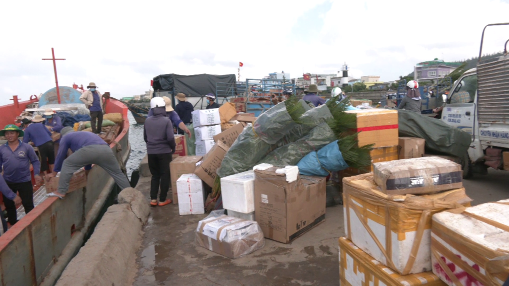 Tranh thủ thời tiết thuận lợi, hàng Tết đã vượt biển từ đất liền ra đảo Lý Sơn. Trung bình mỗi ngày có 03 chuyến tàu vận tải chở hơn 200 tấn hàng Tết ra Lý Sơn.