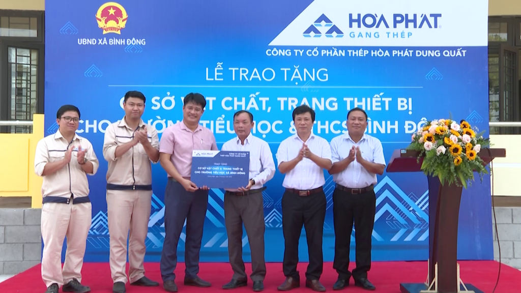 Công ty Cổ phần Thép Hòa Phát Dung Quất tài trợ xây mới 4 phòng học tại cơ sở 2 của Trường Tiểu học và Trung học cơ sở xã Bình Đông. Công ty đầu tư sửa chữa hệ thống tường rào, phòng học và trang bị hàng loạt bàn ghế, trang thiết bị phục vụ nhu cầu dạy và học tại các trường. Tại xã Bình Thuận, Công ty Cổ phần Thép Hòa Phát Dung Quất hỗ trợ xây mới 2 phòng học, sửa chữa, cải tạo khu vui chơi trẻ em và tài trợ các trang thiết bị máy vi tính, ti vi, máy chiếu, tủ lưu trữ hồ sơ cho Trường mầm non 1/3 và Trạm y tế xã.