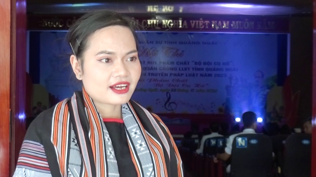 Chị Đinh Thị Thoang, Đội thi Ban Chỉ huy Quân sự huyện Minh Long, Quảng Ngãi chia sẻ: Bản thân là lần đàu tiên tham gia hội thi và trong quá trình tổ chức thực hiện tập thì chúng tôi và cán bộ chiến sĩ Ban CHQS huyện Minh Long tập luyện tích cực và hăng hái, và hôm nay đến với hội thi này chúng tôi thể hiện hết mình hoàn thành phần thi chúng tôi thấy rất vui và trong lòng cảm thấy rất ý nghĩa vì đã đóng góp một phần công sức của vào sự thành công chung của hội thi.