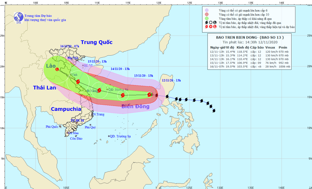 Trong 24 đến 48 giờ tiếp theo, bão di chuyển chủ yếu theo hướng Tây Tây Bắc, mỗi giờ đi được 15-20km. Đến 13 giờ ngày 14/11, vị trí tâm bão ở khoảng 16,1 độ Vĩ Bắc; 110,4 độ Kinh Đông, trên vùng biển phía Tây Nam quần đảo Hoàng Sa. Sức gió mạnh nhất vùng gần tâm bão mạnh cấp 12 (115-135km/giờ), giật cấp 15 .