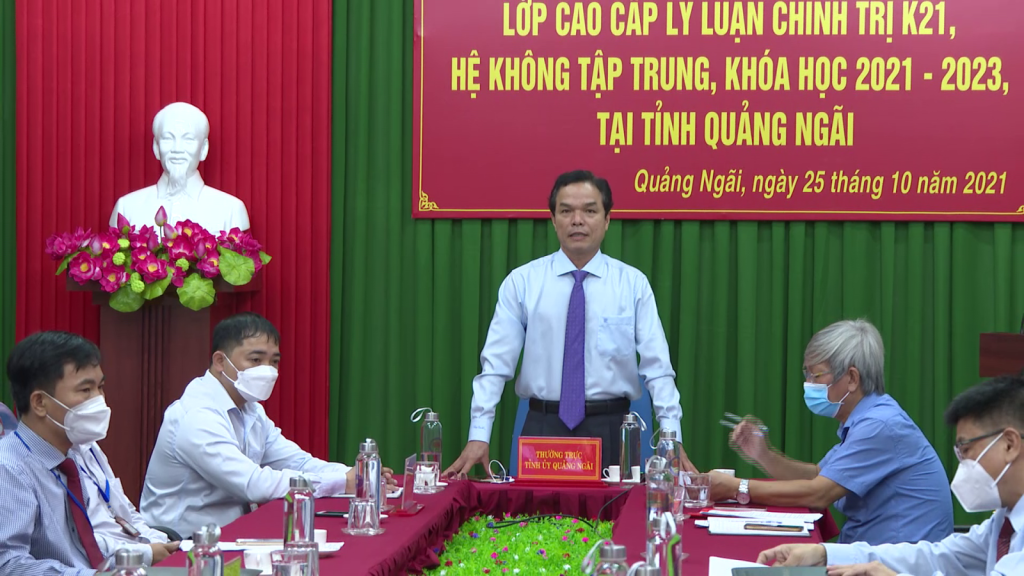Sáng nay 25/10, Học viện Chính trị khu vực III (Học viện Chính trị Quốc gia Hồ Chí Minh) phối hợp cùng Tỉnh ủy Quảng Ngãi khai giảng lớp cao cấp lý luận chính trị K21, hệ không tập trung, khóa học 2021 - 2023 tại Quảng Ngãi bằng hình thức trực tuyến. Dự lễ khai giảng tại điểm cầu Trường Chính trị tỉnh có Trưởng Ban Tuyên giáo Tỉnh ủy Đặng Ngọc Dũng.