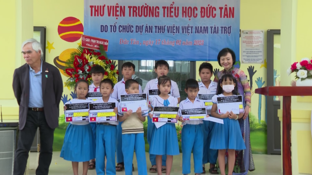 Dịp này, đại diện Tổ chức Dự án thư viện Việt Nam đã trao 10 suất quà, mỗi suất 01 triệu đồng cho 10 em học sinh có thành tích học tốt của trường Tiểu học Đức Tân. Trao tặng quà và sách cho thư viện trường Tiểu học Đức Tân./.