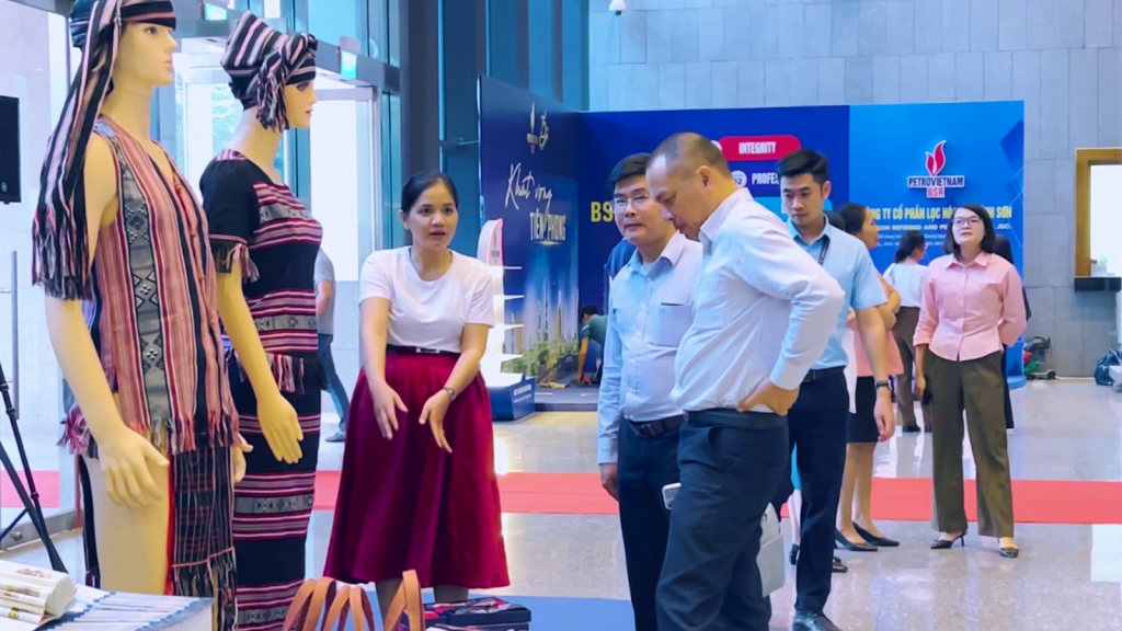 Đặc biệt trong Không gian Quảng Ngãi là gian hàng giới thiệu và trình diễn Di sản Văn hoá phi vật thể quốc gia của Quảng Ngãi gồm: Nghề dệt thổ cẩm truyền thống của người Hre và Nghệ thuật cồng chiêng dân tộc Cor. Cô gái Hrê Phạm Thị Y Hòa đến từ Làng Teng, xã Ba Thành, huyện Ba Tơ đã chuẩn bị sẵn sàng cho gian hàng giới thiệu nghề truyền thống của dân tộc mình. Sản phẩm khăn, túi, cà vạt với màu sắc ấn tượng, giúp cho đại biểu tham dự Hội nghị có cái nhìn rõ nét về dệt thổ cẩm làng Teng.