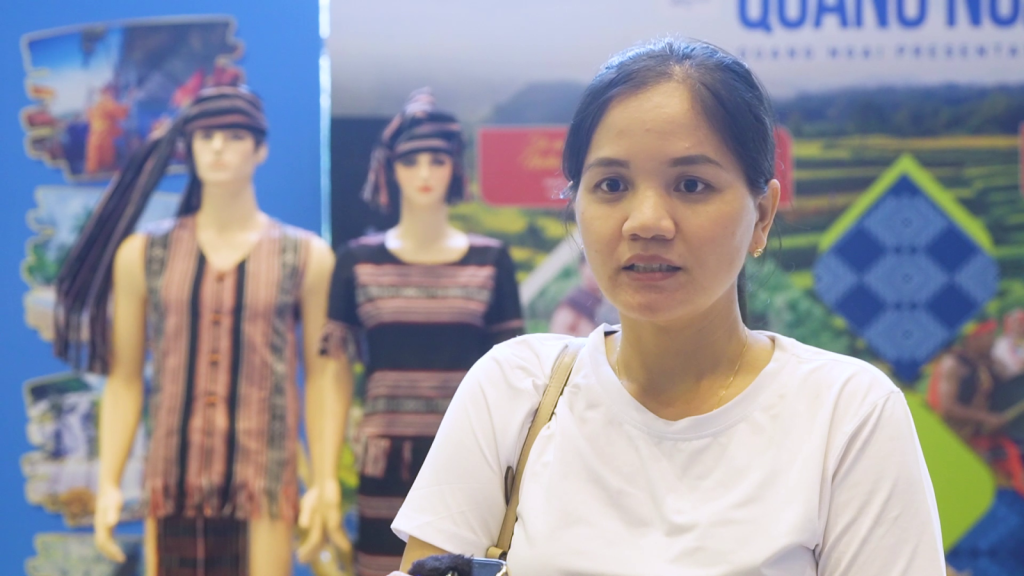 Chị Phạm Thị Y Hòa, Làng Teng, xã Ba Thành, Ba Tơ, Quảng Ngãi nói: Ngày mai thì mình sẽ trình diễn dệt một số sản phẩm, đặc biệt là bộ khung dệt truyền thống của người Hre. Mình sẽ thể hiện ở đây một số công đoạn dệt cùng công cụ đặc sắc của người dân tộc Hre, cùng dụng cụ.