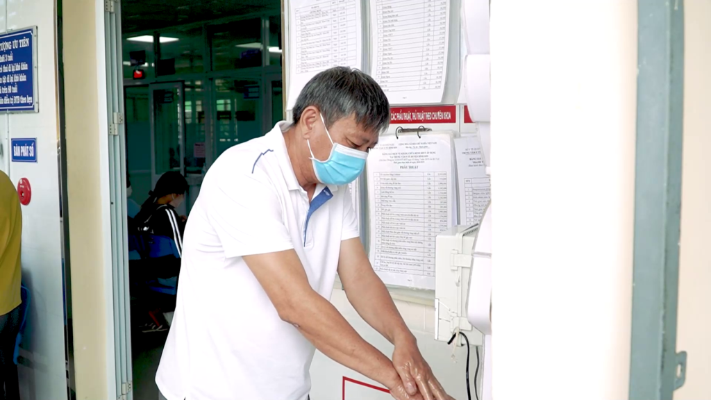 Máy sát khuẩn tay tự động được đặt ngay vị trí ra vào khu khám bệnh của Trung tâm Y tế huyện Bình Sơn. Người bệnh đến khám được bảo vệ nhắc nhở thực hiện vệ sinh tay, mang khẩu trang để an toàn phòng dịch COVID-19.