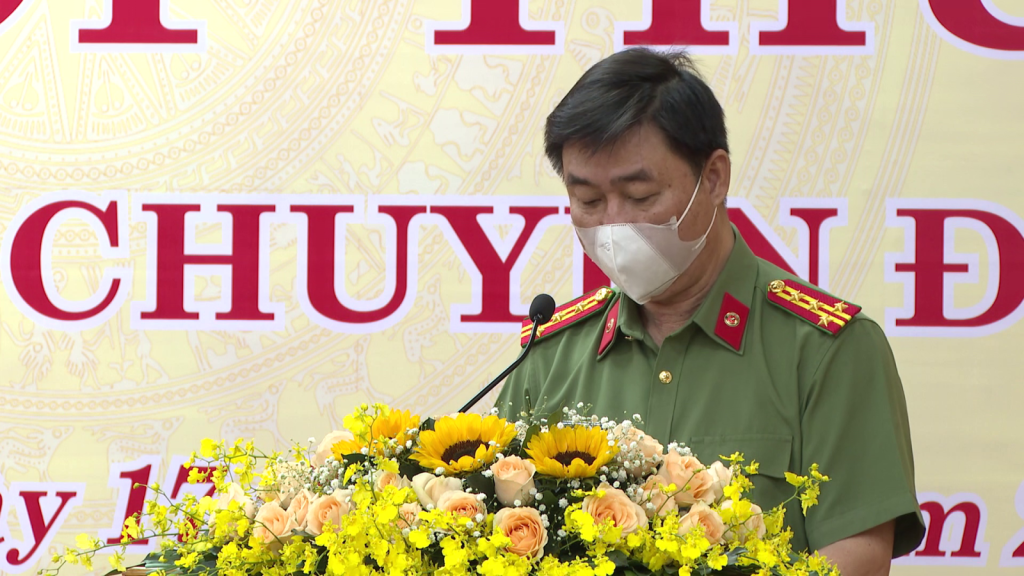 Giám đốc Công an tỉnh trình bày Dự thảo Nghị quyết quy định diện tích nhà ở tối thiểu 8m2 sàn/người để được đăng ký thường trú tại chỗ ở hợp pháp do thuê, mượn, ở nhờ trên địa bàn tỉnh Quảng Ngãi.