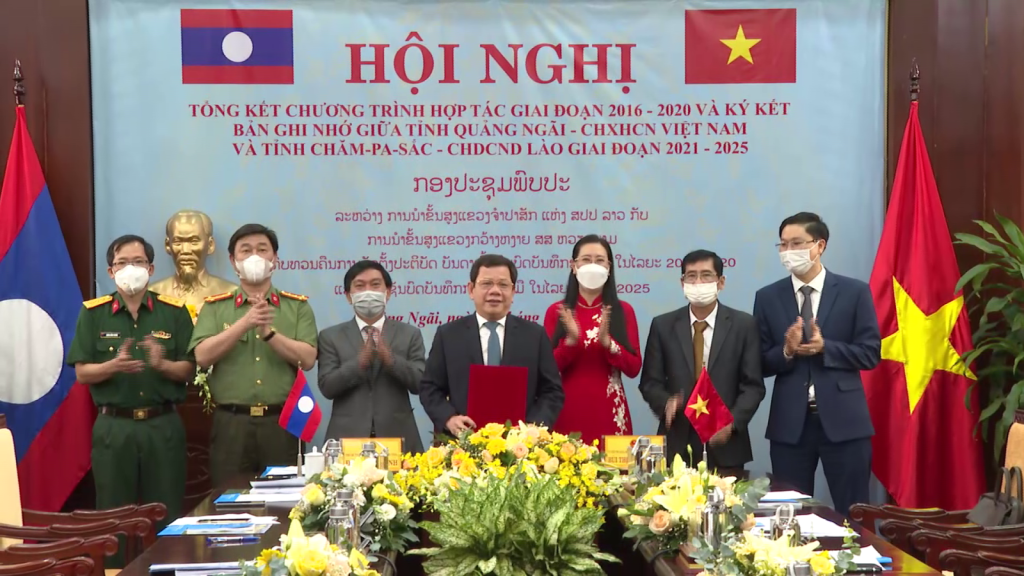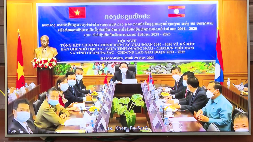 Sáng nay 29/10, tỉnh Quảng Ngãi và tỉnh Champasak, nước Cộng hòa dân chủ nhân dân Lào đã tổ chức Hội nghị trực tuyến tổng kết chương trình hợp tác giai đoạn 2016 - 2020 và ký kết Bản ghi nhớ giữa 2 tỉnh, giai đoạn 2021 - 2025. Ủy viên TW Đảng, Bí thư Tỉnh ủy, Chủ tịch HĐND tỉnh Bùi Thị Quỳnh Vân; Chủ tịch UBND tỉnh Đặng Văn Minh chủ trì tại điểm cầu Quảng Ngãi. Ủy viên TW Đảng Nhân dân cách mạng Lào, Bí thư Tỉnh ủy, Tỉnh trưởng tỉnh Champasak Vilayvong Bouddakham chủ trì hội nghị tại điểm cầu tỉnh Champasak.