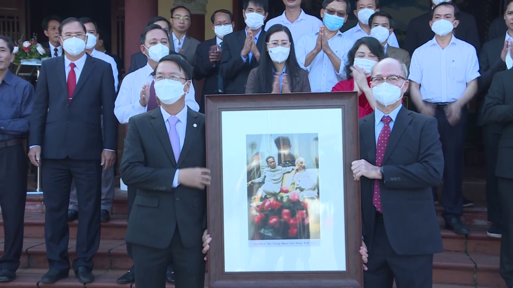 Gia đình Thiếu tướng Phạm Sơn Dương đã trao quà lưu niệm là những hình ảnh về Thủ tướng Phạm Văn Đồng với Chủ tịch Hồ Chí Minh cho quê hương Mộ Đức và Khu lưu niệm./.