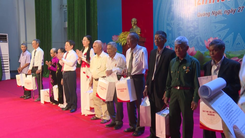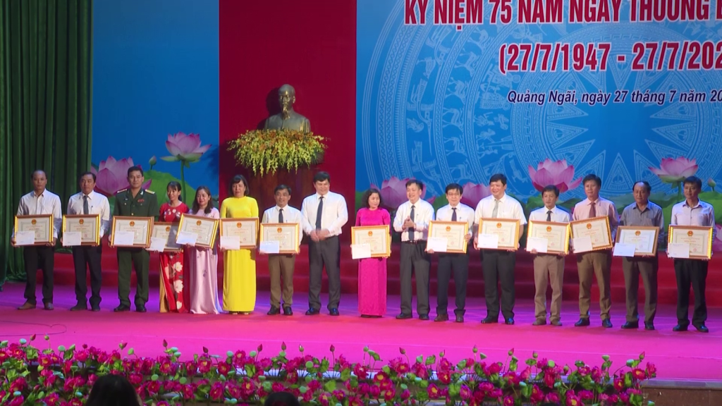 Đọc diễn văn tại lễ kỷ niệm, Phó Bí thư Tỉnh uỷ, Chủ tịch UBND tỉnh Đặng Văn Minh khẳng định, 75 năm qua, nhất là hơn 35 năm đổi mới đất nước, Đảng bộ, chính quyền và Nhân dân tỉnh Quảng Ngãi đã không ngừng phát huy truyền thống “Uống nước nhớ nguồn”, “Ăn quả nhớ người trồng cây”. Luôn quan tâm, chăm sóc thương binh, bệnh binh, gia đình liệt sĩ, Mẹ Việt Nam anh hùng, người có công với cách mạng bằng những việc làm ý nghĩa, thiết thực. Đến nay, tỉnh Quảng Ngãi có trên 181.000 lượt được xác nhận là người có công với cách mạng, chiếm 14,5% dân số toàn tỉnh. Trong đó có hơn 37.400 liệt sĩ, 785 Cán bộ Lão thành cách mạng, 726 Cán bộ Tiền khởi nghĩa, hơn 25.000 thương binh, người hưởng chính sách như thương binh, 5.170 bệnh binh, hơn 10.000 người hoạt động cách mạng, hoạt động kháng chiến bị địch bắt tù đày, hơn 37.000 người được tặng thưởng Huân chương, Huy chương kháng chiến, hơn 5.800 người tham gia kháng chiến và con đẻ bị nhiễm chất độc hóa học… Đặc biệt, toàn tỉnh có 6.817 Bà mẹ được Đảng, Nhà nước phong tặng và truy tặng Danh hiệu vinh dự Nhà nước “Bà mẹ Việt Nam anh hùng”. Hiện còn sống 208 mẹ và được các cấp, các ngành, cộng đồng xã hội quan tâm chăm sóc và nhận phụng dưỡng. Công tác giải quyết các chính sách ưu đãi cho người có công, thân nhân của người có công với cách mạng luôn được quan tâm chú trọng. Tính từ năm 2017 đến nay đã giải quyết, công nhận hơn 20.000 trường hợp đủ điều kiện hưởng chế độ ưu đãi theo quy định. Mỗi năm, tỉnh Quảng Ngãi phân bổ hơn 70 tỷ đồng để làm quà tặng, thăm hỏi, động viên người có công và gia đình liệt sỹ trên địa bàn tỉnh nhân ngày thương binh, liệt sĩ và Tết Nguyên đán. Tỉnh cũng đã ban hành Đề án nâng cấp hơn 15.000 phần mộ liệt sĩ, xây mới và sửa chữa 83 công trình liệt sĩ trong giai đoạn 2021 - 2025. Tổng kinh phí dự kiến hơn 124 tỷ đồng.