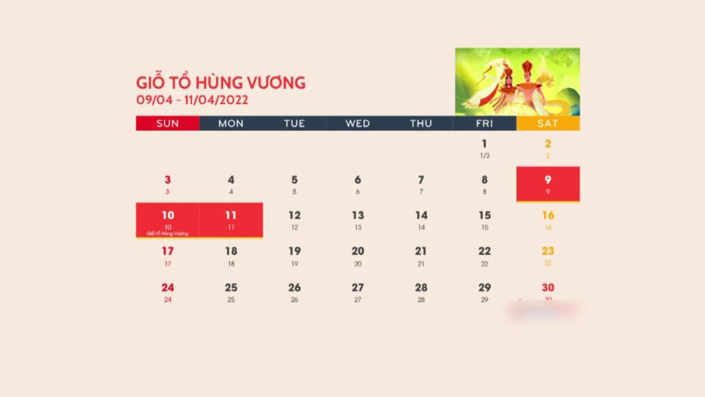 Cụ thể: Ngày Giỗ Tổ Hùng Vương (ngày 10/3 Âm lịch), là ngày 10/4/2022 Dương lịch rơi vào Chủ nhật, nên người lao động sẽ được nghỉ bù vào thứ Hai tuần kế tiếp (ngày 11/4), tức nghỉ liên tục 3 ngày, từ ngày 9 đến hết 11/4.
