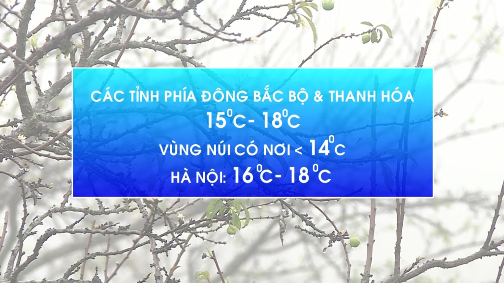 Do ảnh hưởng của không khí lạnh, ở các tỉnh phía Đông Bắc Bộ và Thanh Hóa trời chuyển rét với nhiệt độ thấp nhất phổ biến 15 - 18 độ C, vùng núi có nơi dưới 14 độ C. Riêng khu vực Hà Nội có mưa và mưa rào; trời chuyển rét với nhiệt độ thấp nhất phổ biến 16 - 18 độ C.