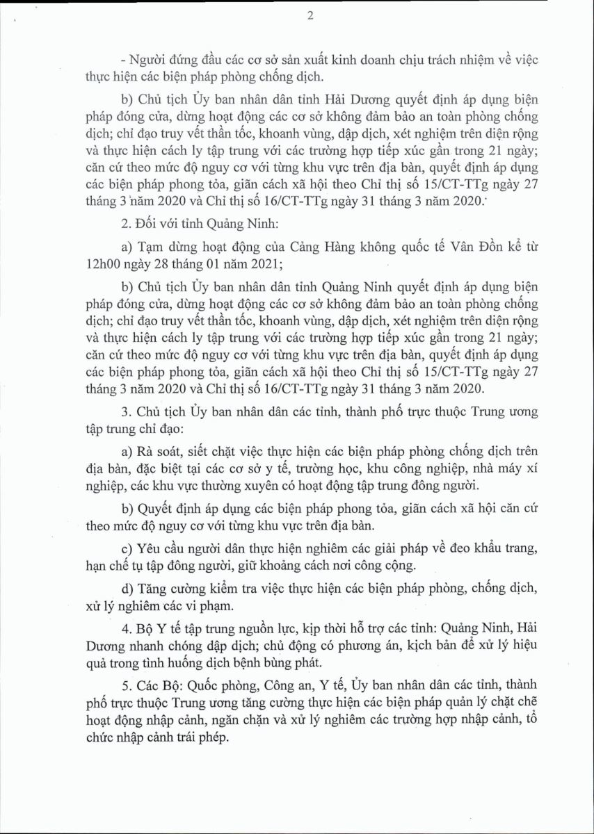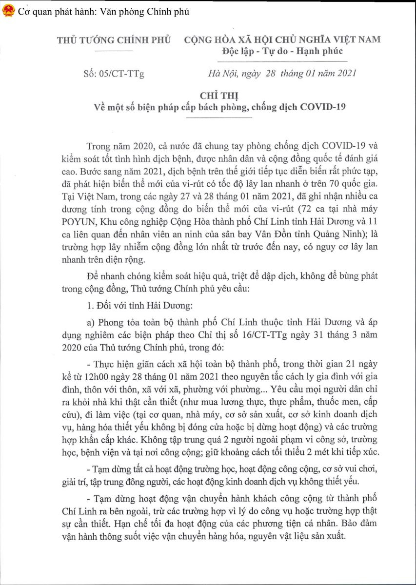 Trước tình hình dịch bệnh Covid - 19 lây lan trong cộng đồng và diễn biến phức tạp tại hai địa phương Quảng Ninh và Hải Dương. Để nhanh chóng kiểm soát hiệu quả, triệt để dập dịch, không để bùng phát trong cộng đồng. Thủ tướng Chính phủ ban hành Chỉ Thị số: 05/CT-TTg ngày 28/01/2021, nội dung công điện như sau: